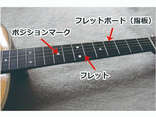 - 指板に埋め込まれた棒状の金属。弦を押さえる位置として、ヘッド側から1フレット2フレットと数えます。
