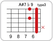右利き用の押さえ方(A#(B♭)7 ♭9)